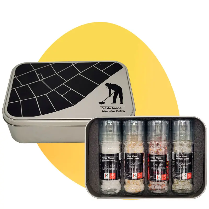 Salt Valley metal box with 4 Añana Salt grinders with: cayenne, garlic, Provençal herbs and natural.