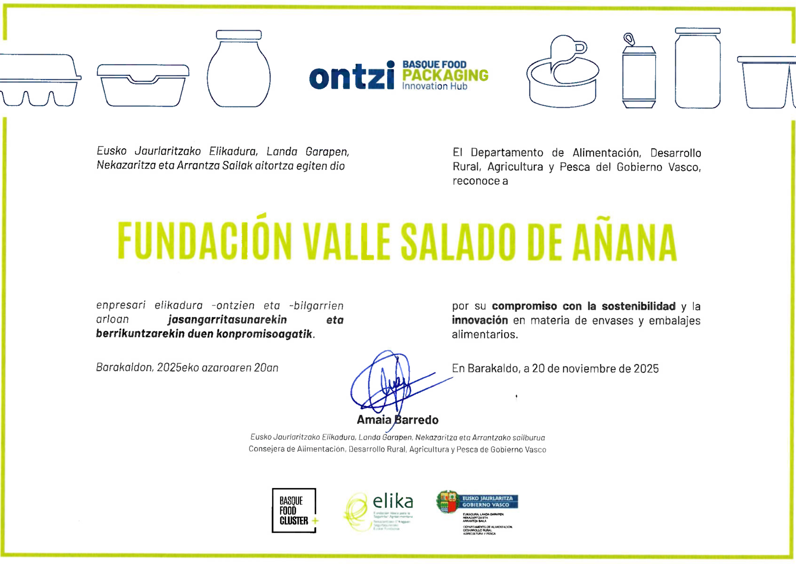 La Fundación Valle Salado de Añana ha sido reconocida por el Gobierno Vasco por su compromiso con la innovación en el envasado alimentario dentro del proyecto Ontzi.